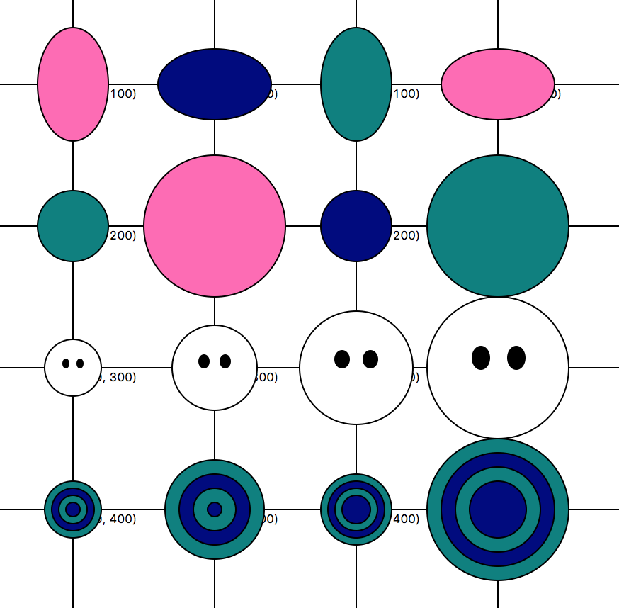 Your job: Currently, this function creates a hard-coded circle with a top-left coordinate of (300, 100), and a bottom-right coordinate of (400, 200) — which effectively draws it at a centerpoint of (350, 150), with a radius of 50. Your job is to modify the code so that the top-left (x, y) and bottom-right (x, y), and fill color are determined by the arguments passed into the function.